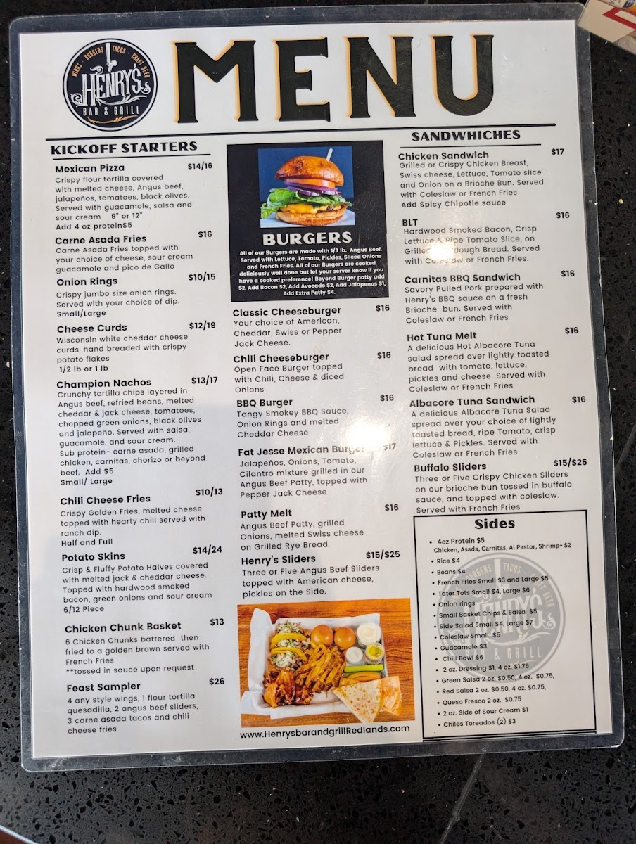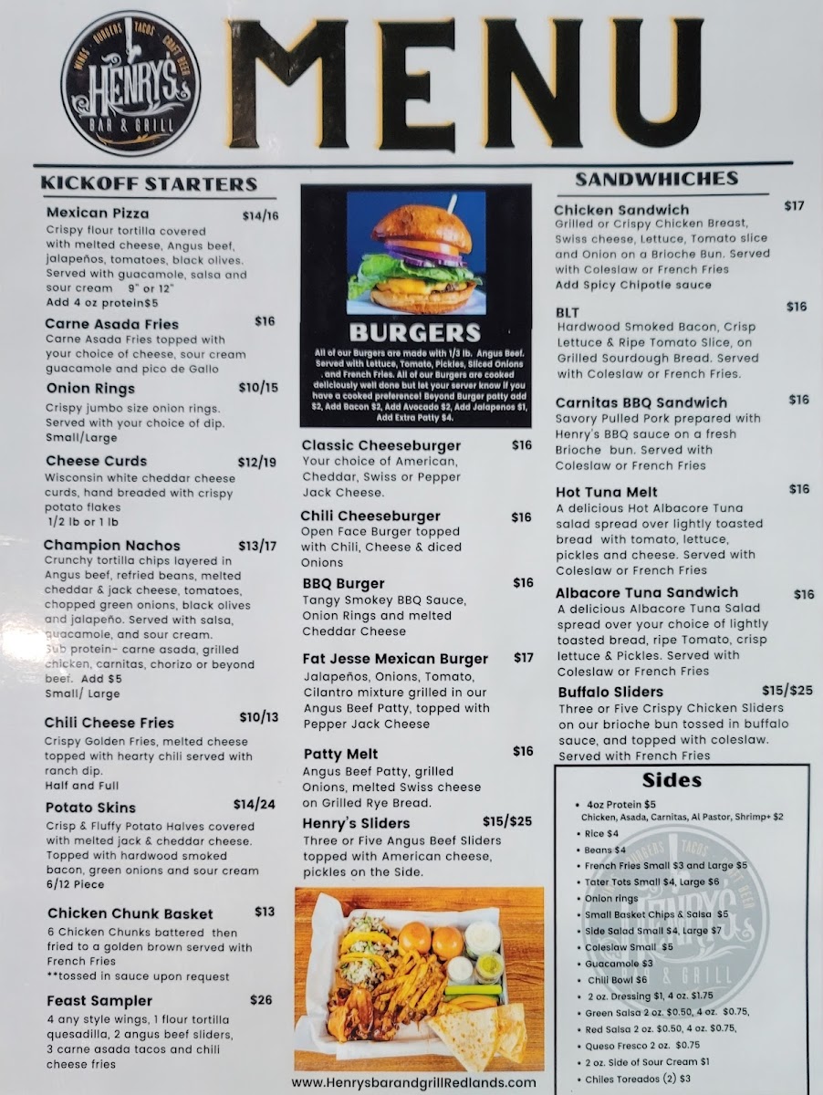 When you visit Henry's Bar And Grill, you’re in for a laid-back yet flavorful experience. Nestled at 501 W Redlands Blvd, this spot serves up a diverse menu that blends classic comfort food with a few unexpected twists. Whether you're in the mood for a juicy burger, crispy wings, or something a bit more adventurous, there’s something here for everyone. The menu also features a range of refreshing drinks to pair perfectly with your meal, from ice-cold beers to signature cocktails.